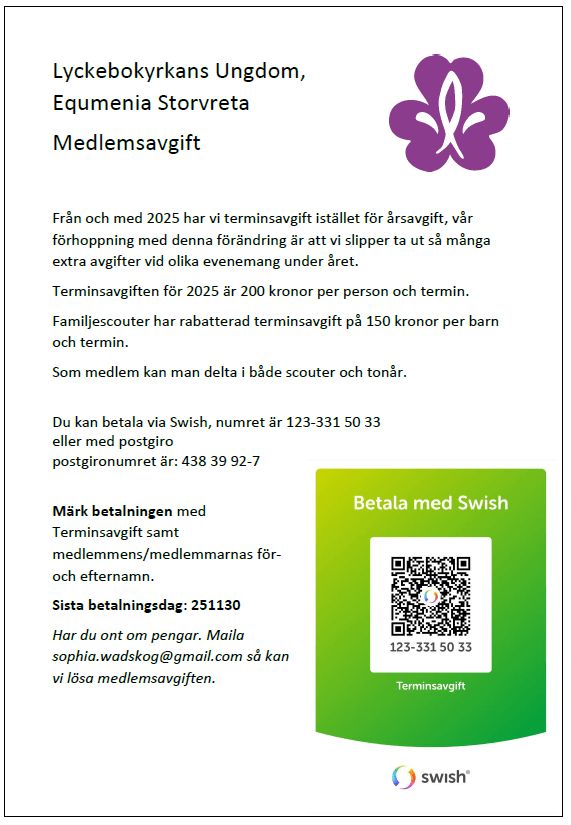 Scouterna vill vara en aktivitet för alla. Har du just nu svårt att betala terminsavgift, lägeravgift, hajkavgift eller utrustning så hör av dig till kårchef Sophia Wadskog på mailadress: sophia.wadskogatgmail.com så kan scoutkåren hjälpa till.