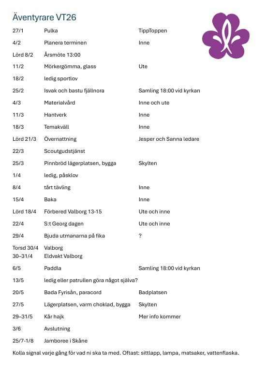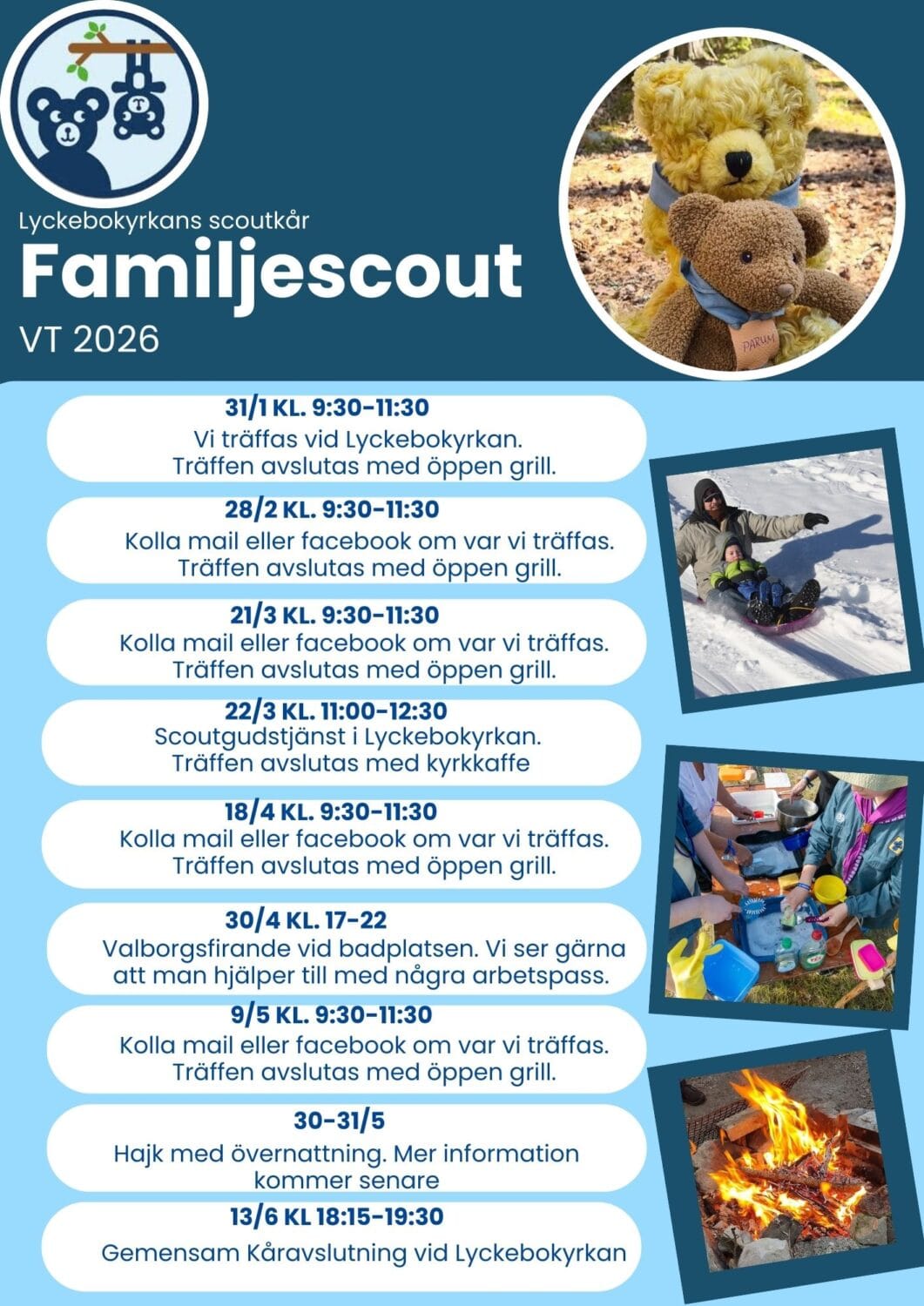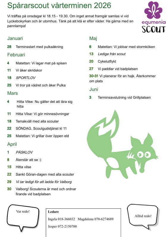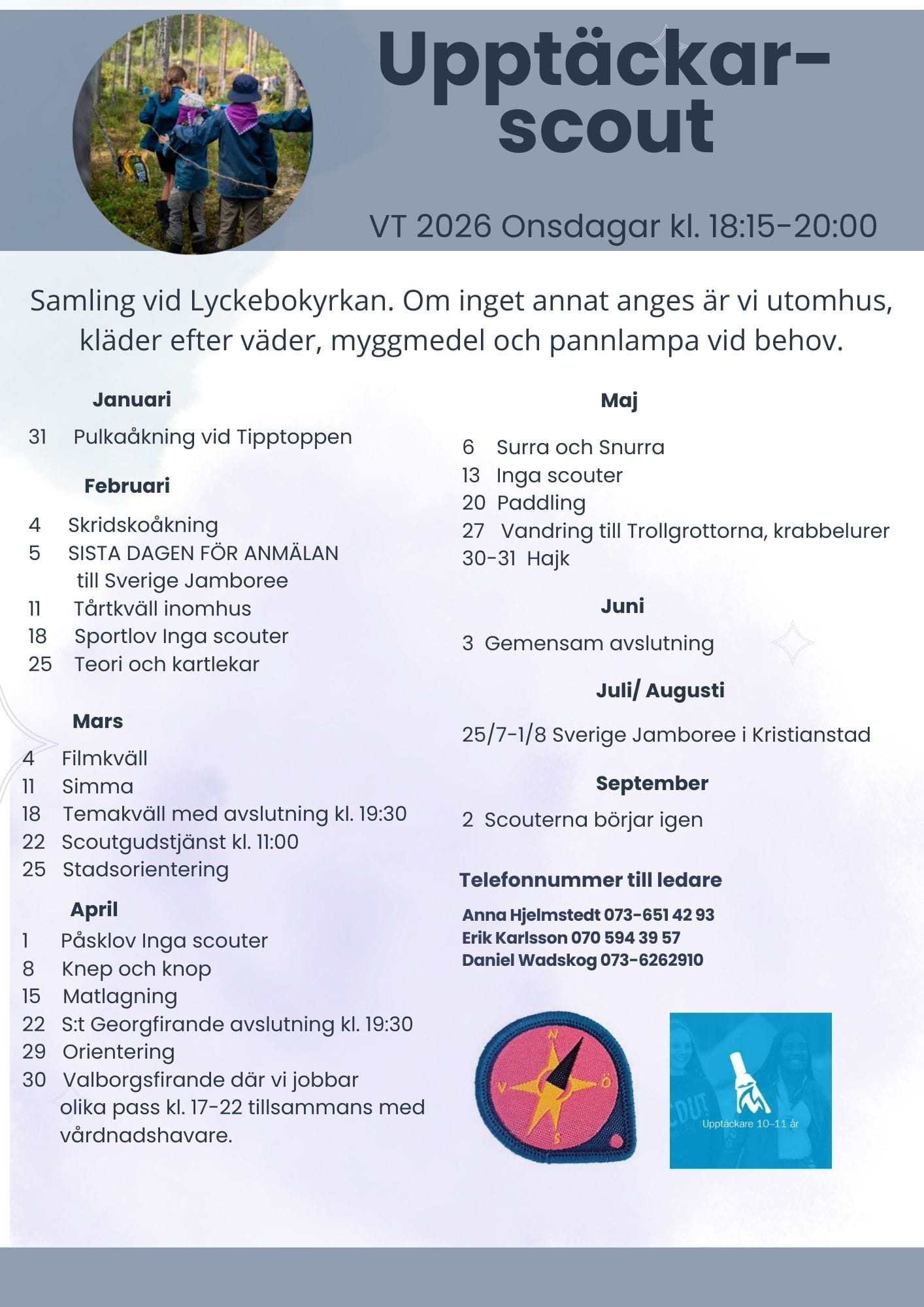 Scouterna samlas onsdagar klockan 18.15 vid Lyckebokyrkan om ej annat anges. Ha kläder efter väder. Vi gör allt från att lära oss hantera kniv till att ha filmkväll.